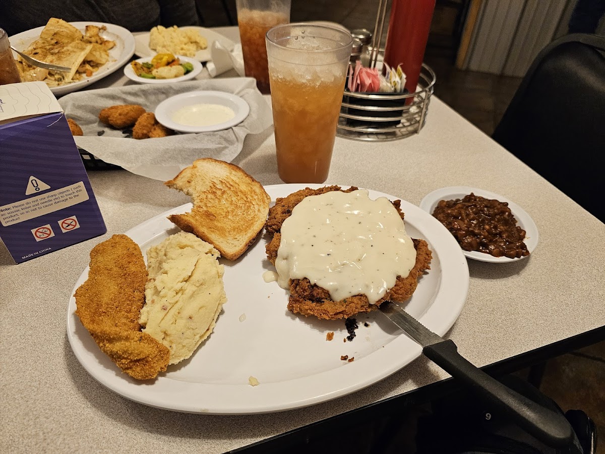 Hubs and I shared a chicken fried steak “dinner” for lunch…great flavor, one of the best we’ve had. Fries and homemade coleslaw were good too, flavorful sauce on the slaw not runny. Took a blackberry cobbler home for later that was delish! Not too sweet with chunks of blackberries. Would definitely eat here again. Friendly staff, quick service on a Sunday in late April.